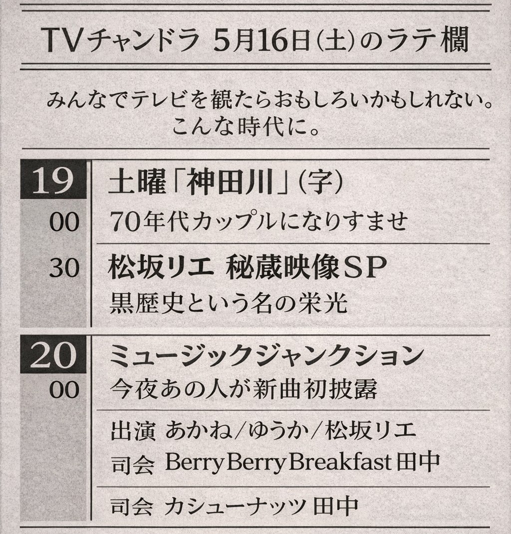 展示・ライブ・出前BGM 田中屋のTVチャンドラのラテ欄「VHSテープ上映&実演音楽番組」5月16日inチャンドラスーリヤ