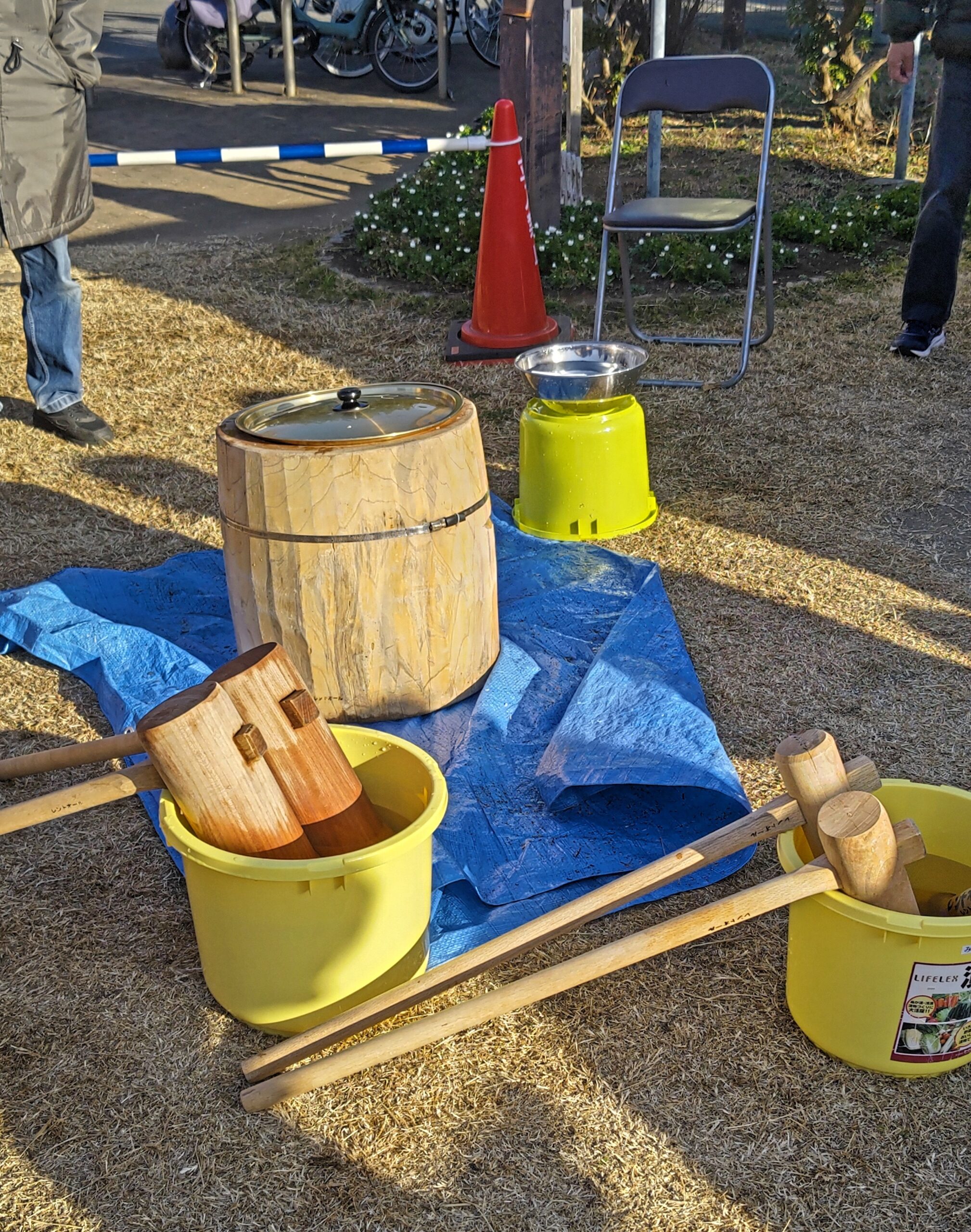 ベンチで食べれば、湯気の向こうに餅つきの一連の流れが見える。
